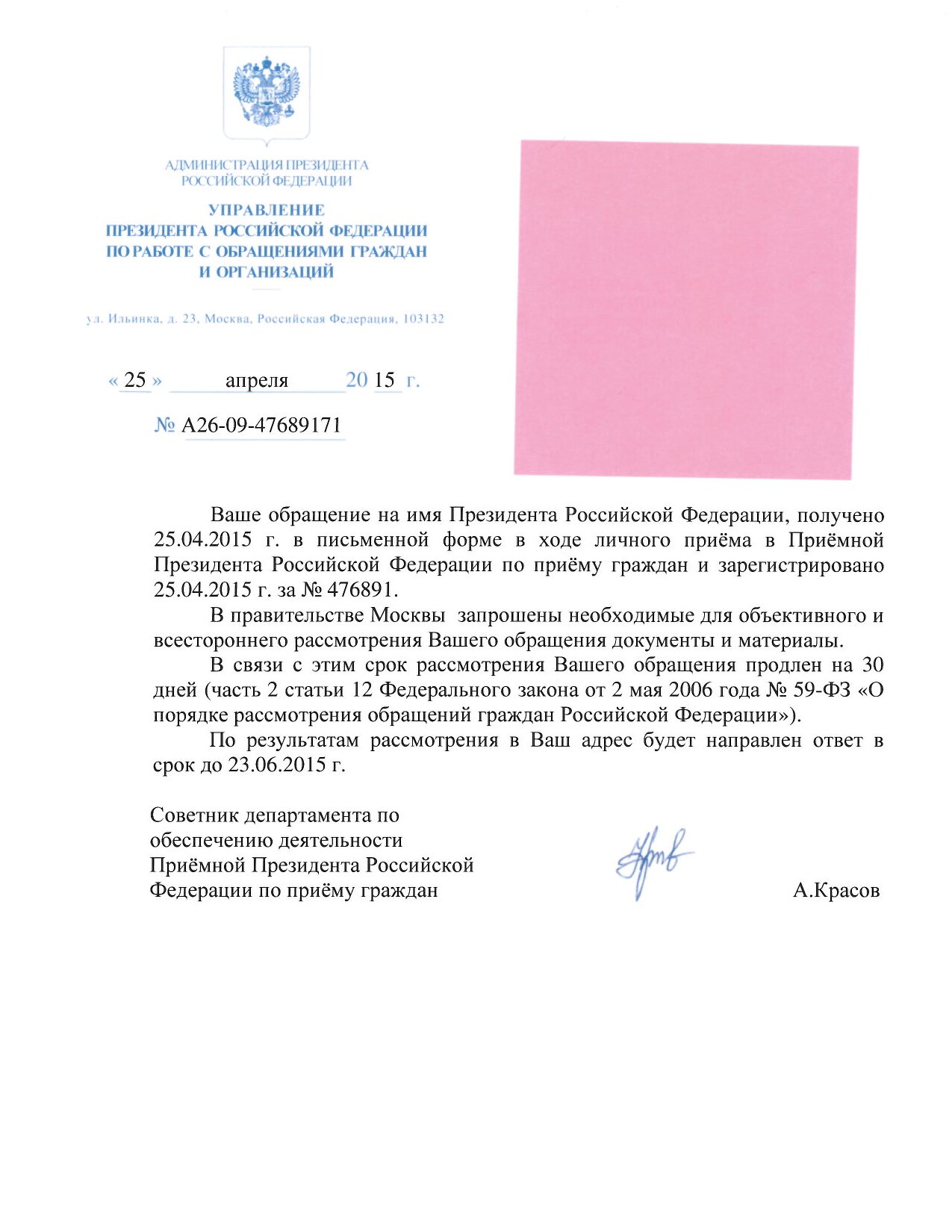 Ваше обращение на имя Президента Российской Федерации, полученное 25.04.2015 г. в письменной форме в ходе личного приёма в Приемной Президента Российской Федерации по приему граждан и зарегистрированное 25.04.2015 г. за №476891, рассмотрено.